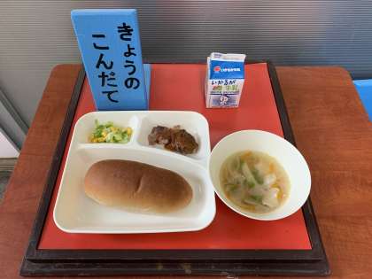 豚肉のデミグラスソース、スープ、キャベツとコーンのソテー、黒糖パン、牛乳です。