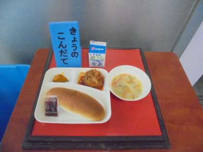 煮こみハンバーグ、コーンスープ、パン、牛乳です。