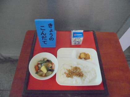 鶏肉とじゃがいもの煮もの、あつあげのしょうゆだれかけ、紅ざけそぼろ、ごはん、牛乳です。