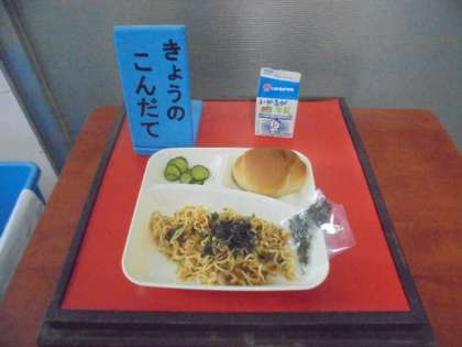 焼きそば、きゅうりのしょうがづけ、パン、牛乳です。