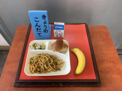 カレースパゲッティ、キャベツのひじきドレッシング、バナナ、2分の1黒糖パン、牛乳です。