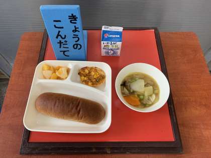 豚肉と野菜のカレースープ煮、変わりピザ、ミックスフルーツ(缶)、黒糖パン、牛乳 です。