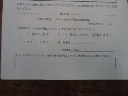 今日、子どもたちにプール水泳学習への参加についてのお知らせを配りました。「参加します」「参加しません」の参加確認書を6月8日(火)までにご提出ください。