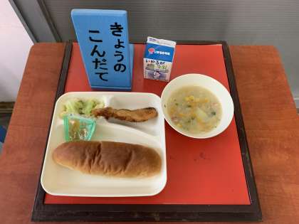 サーモンフライ、豆乳スープ、キャベツのソテー、りんごジャム、大型コッペパン、牛乳 です。
