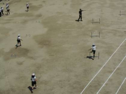 (上)運動場でハードル走