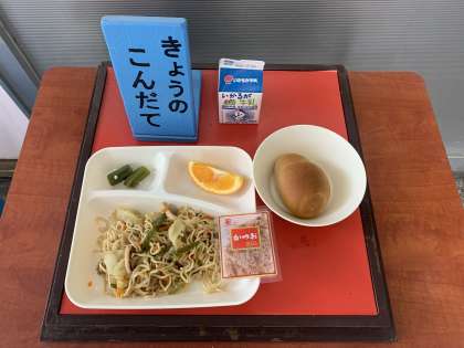 和風やきそば、オクラの甘酢あえ、オレンジ、2分の1黒糖パン、牛乳 です。