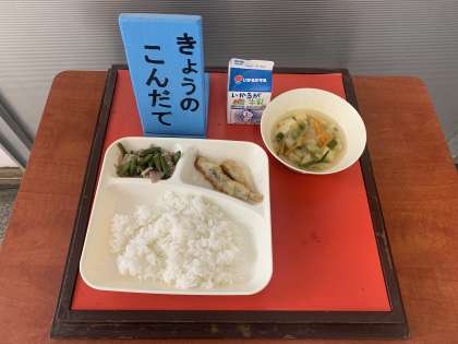 いわしてんぷら、五目汁、豚肉とさんどまめのいためもの、ごはん、牛乳です。