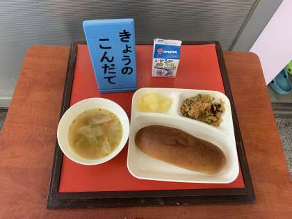 カレードリア、豚肉とキャベツのスープ、りんご(カット缶)、黒糖パン、牛乳 です。