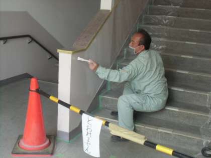 管理作業員の日野さんが、階段の壁にペンキを塗ってくださっています。