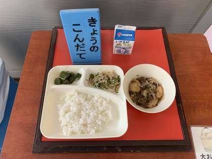 すき焼き煮、オクラのかつお梅風味、もやしとピーマンのごまいため、ごはん、牛乳 です。