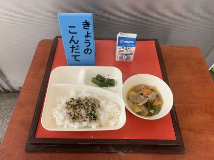 豚肉とじゃがいもの煮もの、オクラの梅風味、ツナっ葉いため、ごはん、牛乳 です。