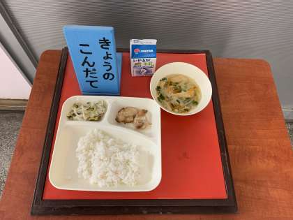 鶏肉のしょうゆマヨネーズ焼き、五目汁、切干し大根のゆずの香あえ、ごはん、牛乳 です。