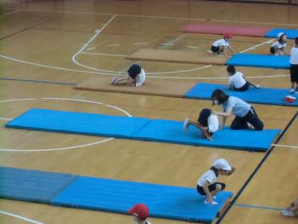 (2組)マットうんどう せんせいがひとりずつサポートしています