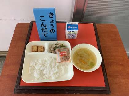 ゴーヤチャンプルー、すまし汁、あつあげのしょうがじょうゆかけ、ごはん、牛乳 です。