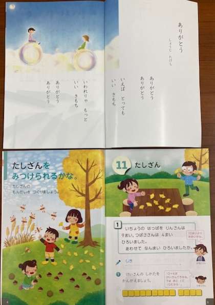 写真は、1年生のこくごとさんすうの教科書で、最初のページです。