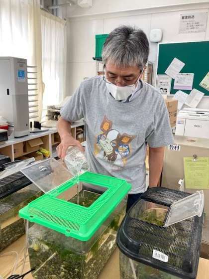 谷山教頭先生が、メダカの水槽に水を足してくださっています。