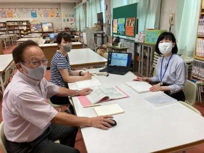 朝早くから、写真左から順に学校図書館補助員の小前先生、本校の木下先生とコーディネーターの吉本さんが、打合せをしてくださっています。