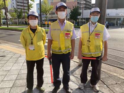 登校時に、子どもたちの安全を見守ってくださっている地域の方々が、たくさんいらっしゃいます。写真は、難波中学校前の稲荷交差点の見守りをしてくださっている方です。塩草立葉小学校の子どもたちは、塩草地域と立葉地域の皆様に見守っていただいています。ありがとうございます。