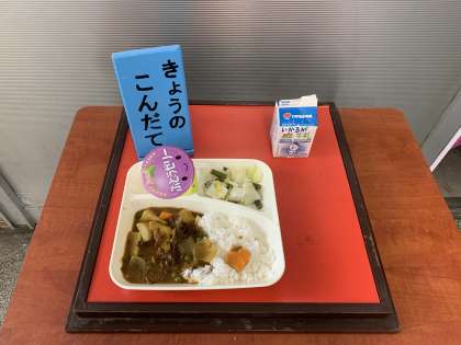 ビーフカレーライス(米粉)、野菜のピクルス、ぶどうゼリー、牛乳 です。