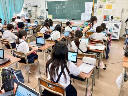 (上)1組 一人一台パソコンで、言葉の意味調べをしています。