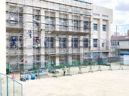 北校舎の外壁改修工事をしています。来年2月末には終わる予定です。