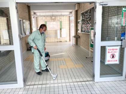 玄関で、管理作業員の日野さんが清掃をしてくださっていました。