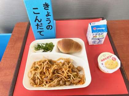 今日の献立は、イタリアンスパゲッティ、グリーンアスパラガスとキャベツのサラダ、みかんゼリー、黒糖パン、牛乳です。