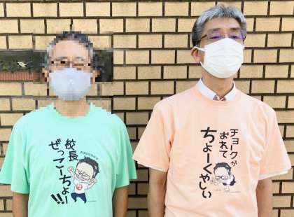 本日、「アトリエしろの」の白野 寿子様(写真左)が、投稿者をモデルにしたオリジナルTシャツを2枚お持ちくださいました。