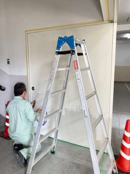 管理作業員の日野さんが、防火扉を塗装してくださっています。