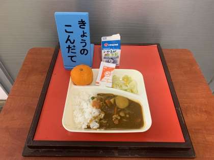 チキンカレーライス[米粉]、みかん(冷)、キャベツとコーンのサラダ(ノンエッグドレッシング)、牛乳 です。