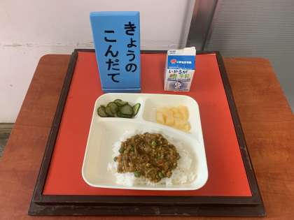 大豆入りキーマカレーライス[米粉]、きゅうりのピクルス、白桃(カット缶)、牛乳 です。