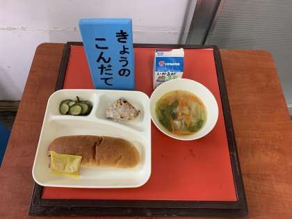 かつおのマリネ焼き(ノンエッグドレッシング)、鶏肉とじゃがいものスープ、きゅうりのサラダ、大型コッペパン、アプリコットジャム、牛乳 です。