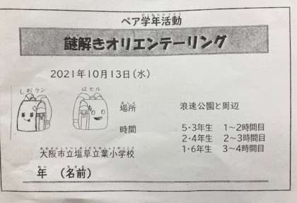 近隣の浪速公園付近をペア学年のグループで、クイズを解きながら、まわっていきます。子どもちゃんたちは、とても楽しみにしています。