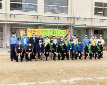 今日の夕方、本校運動場で、全国地域安全運動初日行事として、浪速区の青色防犯パトロール隊出発式が開かれました。
