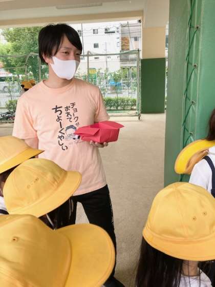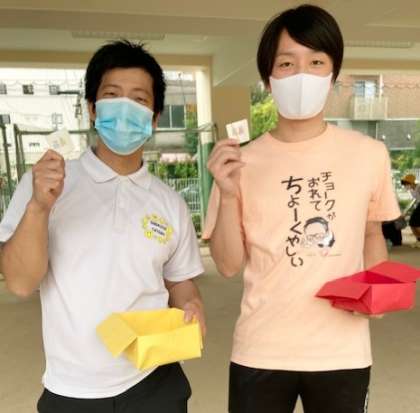 ゴール地点では、教務主任の井元先生と事務職員の事務王子 南さん(投稿者、急な出張のため)が子どもちゃんにご褒美シールを渡しました。