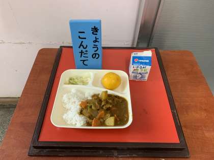 ポークカレーライス[米粉]、キャベツのピクルス、みかん、牛乳 です。