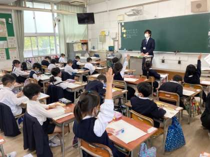 教育実習に来られている桃山学院教育大学の大本 候希さんが、1年2組で公開授業をしました。算数の「繰り下がりのある引き算」をていねいに教えていました。