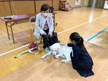 盲導犬ユーザーの山本 美恵子さんとフェリシアちゃんをお招きして、お話を聞きました。毎年、3年生で行っている学習です。