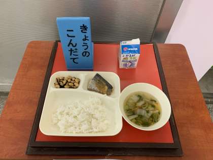 さごしのおろしじょうゆかけ、さといものすまし汁、大豆の煮もの、ごはん、牛乳 です。
