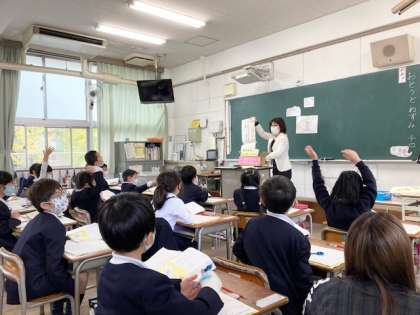 1年2組 宮河 直子先生による国語科「おとうとねずみ チロ」の研究授業です。子どもちゃんたちは、とても集中して話を聞いています。