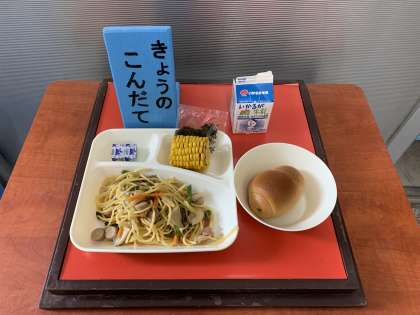 ウインナーときのこの和風スパゲッティ、焼きとうもろこし、固形チーズ、黒糖パン1/2、牛乳 です。