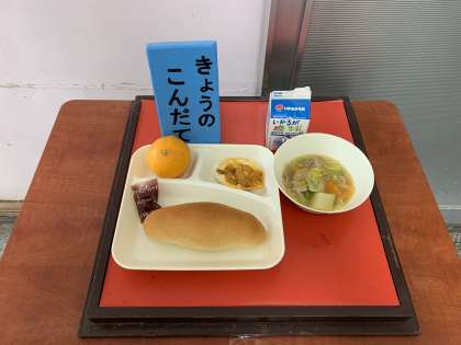 豚肉と野菜のスープ煮、変わりピザ、みかん、大型コッペパン、いちごジャム、牛乳 です。