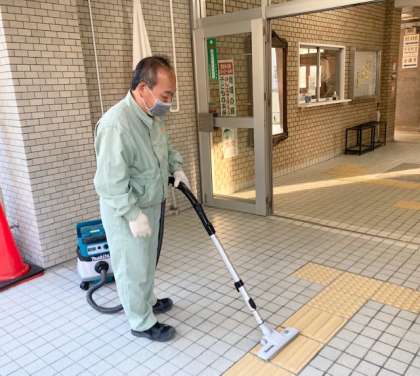 朝早くから、管理作業員の日野さんが玄関を清掃してくださっています。