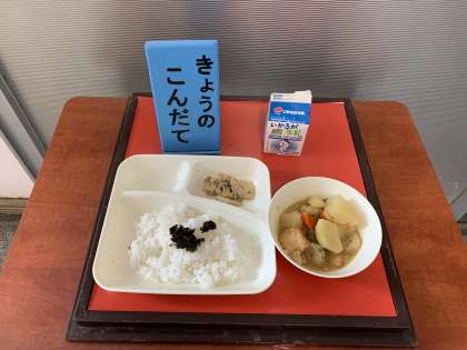 関東煮、れんこんの梅風味焼き、のりのつくだ煮、ごはん、牛乳 です。