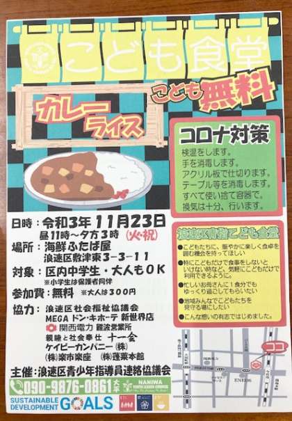 11月23日(火祝)11:00から15:00まで、こども食堂(主催:浪速区青少年指導員連絡協議会)が行われます。