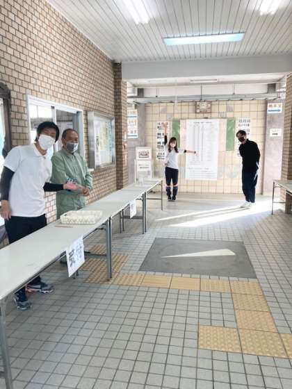 (上)玄関受付を担ってくださっている、左から井元先生、日野さん、平井先生、大島先生。ありがとうございます。