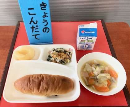(下)スープ煮、ほうれんそうグラタン、白桃(缶)、パン、牛乳です。