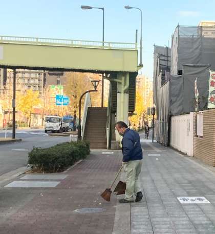 写真は、朝早く玄関前の歩道を清掃している管理作業員の日野さんです。