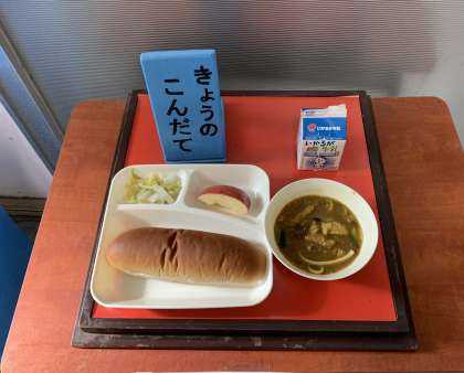 カレーうどん、はくさいの甘酢あえ、りんご、パン、牛乳 です。