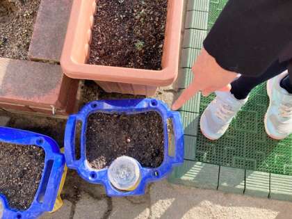 (下)1年生の子どもちゃんが、「みて、みて」チューリップの芽が出ています。